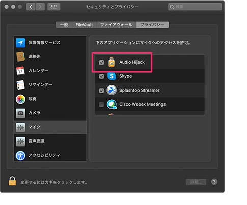 - Audio Hijackをダウンロードしてインストールする。macOSの「システム環境設定」>「セキュリティとプライバシー」で「マイク」へのアクセスを許可する。また、スケジュール録音を使うなら、Schedule Helperもインストールしておく。