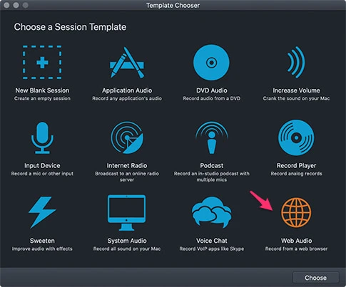 - 「Session」メニュー >「New Session」を選ぶと、テンプレート一覧が開く。任意のアプリケーションなら「Application Audio」、マイクなら「Input Device」、ここでは、Webブラウザーの録音用に「Web Audio」を選ぶ。