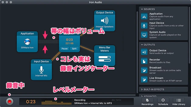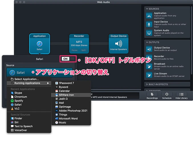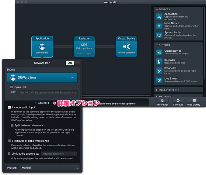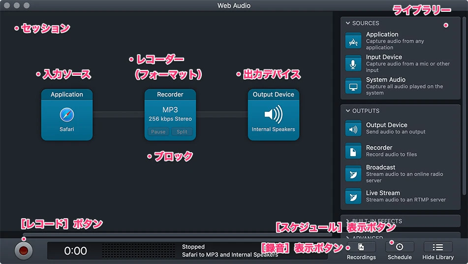 - 「セッション:Web Audio」が開く。左から「アプリケーション:Safari」、「レコーダー:MP3」、「出力デバイス:内蔵スピーカー」の、3つの「ブロック」が開く。3つのブロックは、グレーの帯でつながっていて、連動して動作することを示している。単純に、例えばSafariで再生するYouTubeの音声を録音するには、左下の[レコード]ボタンを押すだけ。