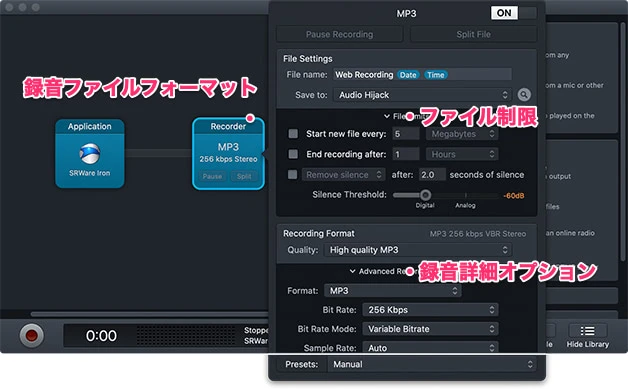 - 「レコーダー」は、オーディオファイル名の型式や保存場所、ファイルフォーマット、タグなどを細かく設定可能。この設定は「プリセット」として保存しておける。また、「レコーダー」は、録音中に操作して「ポーズ」「分割」できる。
