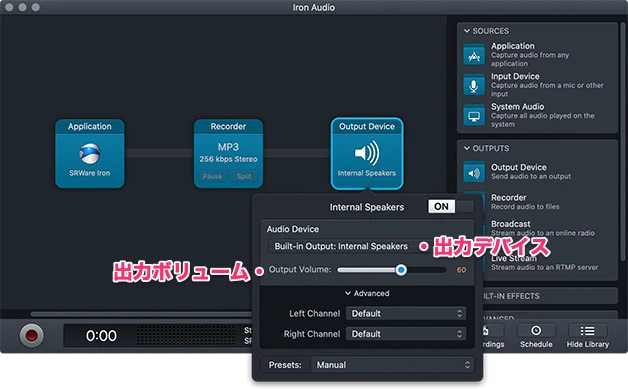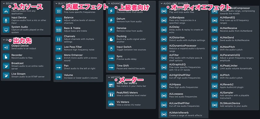 これらの問題を解決できるのが、Audio Hijackというわけ。ちょっと物騒ですが、いろんな入出力ソースやデバイス、フォーマット設定を全部ジャックしてコントロールを奪い、一箇所で集中して扱えるほど強力です。