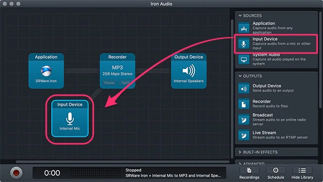 - さらに、「ブロック」はウインドウ右側の「ライブラリー」からドラッグ&ドロップで追加できる。例えば、自分の声も録音する場合は、「ソース:Input Device」を「セッション」にドラッグすると、自動的に「レコーダー」との間が帯でつながれる。メニューバーに録音状態を表示できる「メーター:Menu Bar Meters」もオススメ。「ブロック」をドラッグすると、ガイドのグリッドが表示されるので、自分が把握しやすい位置に自由に配置する。