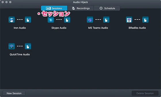 - 「セッション」「レコーディング」「スケジュール」は、「Window」メニュー >「Home Window」で確認できる。「Sessions」タブには、登録した「セッション」がすべて表示される。新規作成や名前の変更、削除もここで操作する。