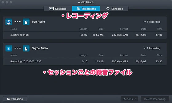 - 「Recordings」タブでは、録音されたファイルを「セッション」ごとに管理する。再生や属性の追加、転送もここで操作する。