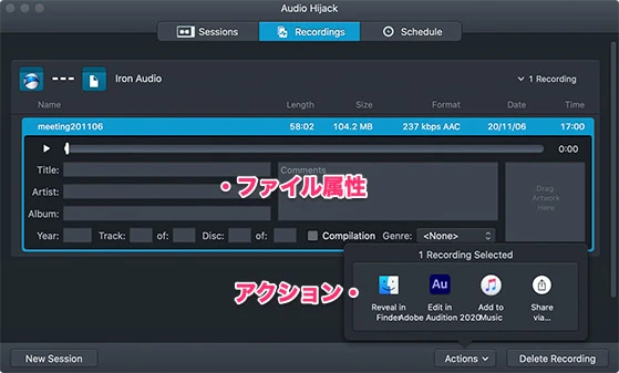 - 録音したファイルに、タイトルやアーティスト、トラックナンバー、カバーアートなどの属性を追加して、ミュージック.appに追加できる。