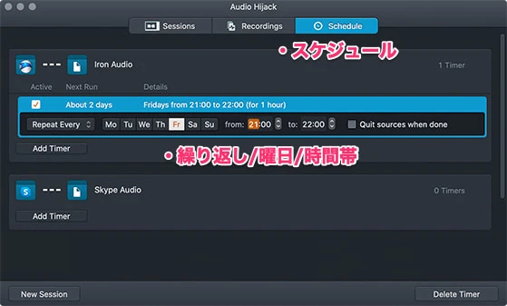 - 「Schedule」タブでは、「セッション」ごとの録音スケジュールを管理する。