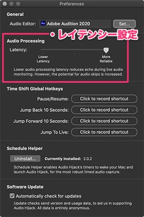 - その他、初期設定の「Auido Processing」は回線状況やデバイスの負荷などに応じて設定する。レイテンシーを下げると、音飛びしやすくなるので、適度に判断を。