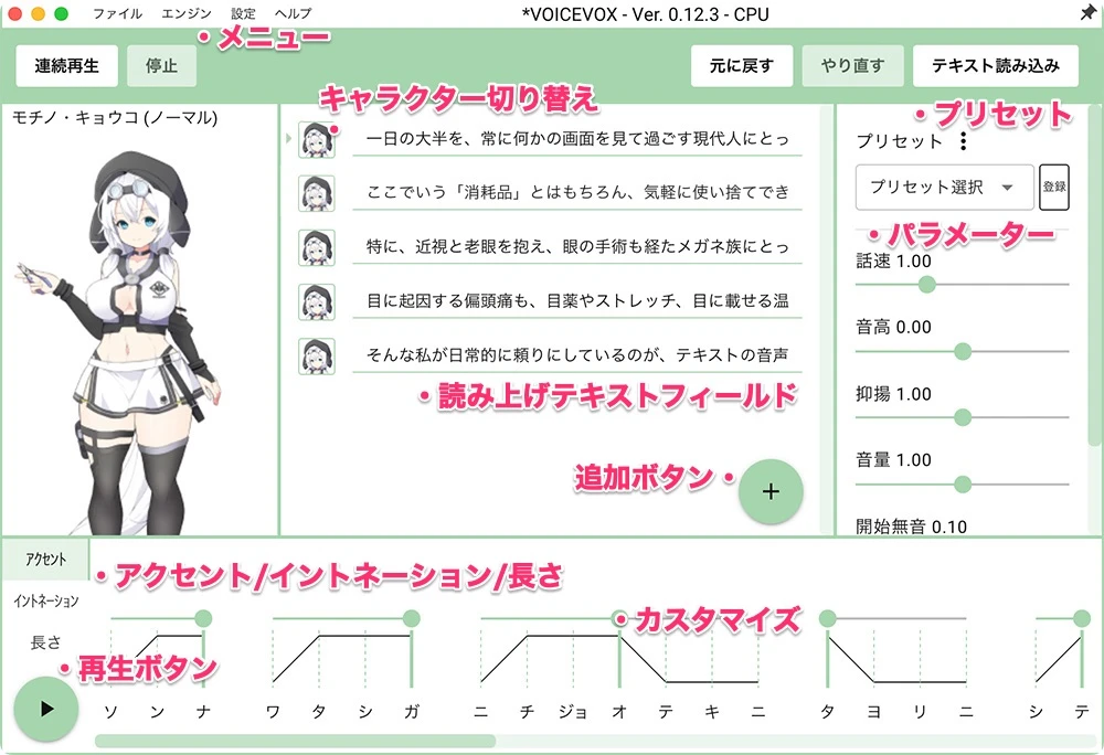 - 読み上げ中のテキスト部分はハイライト表示されない(ウインドウ下の「アクセント」や「イントネーション」「長さ」でハイライトされる)。