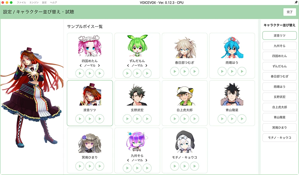 - サンプルボイスのキャラクターは11人。一部のキャラクターには、「ノーマル」「あまあま」「ツンツン」「セクシー」「囁き声」などのバリエーションあり。