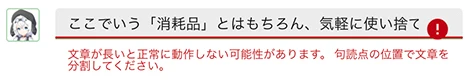 - ペーストまたは読み込まれたテキストは、句点「。」ごとの行に分割される。選択した行の冒頭には、キャラクターアイコンの左に小さいグレーの▶が表示される。80文字以上のテキストには、正しく再生されない可能性を警告するアラートが表示される。