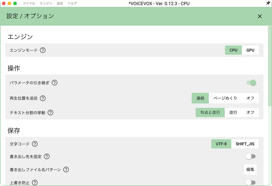 - アプリケーションを起動する。音声エンジンの初期化のため、1分ほど待たされる。「環境設定」で特に設定することはないが、「CPU/GPU」が選べるなら選択。