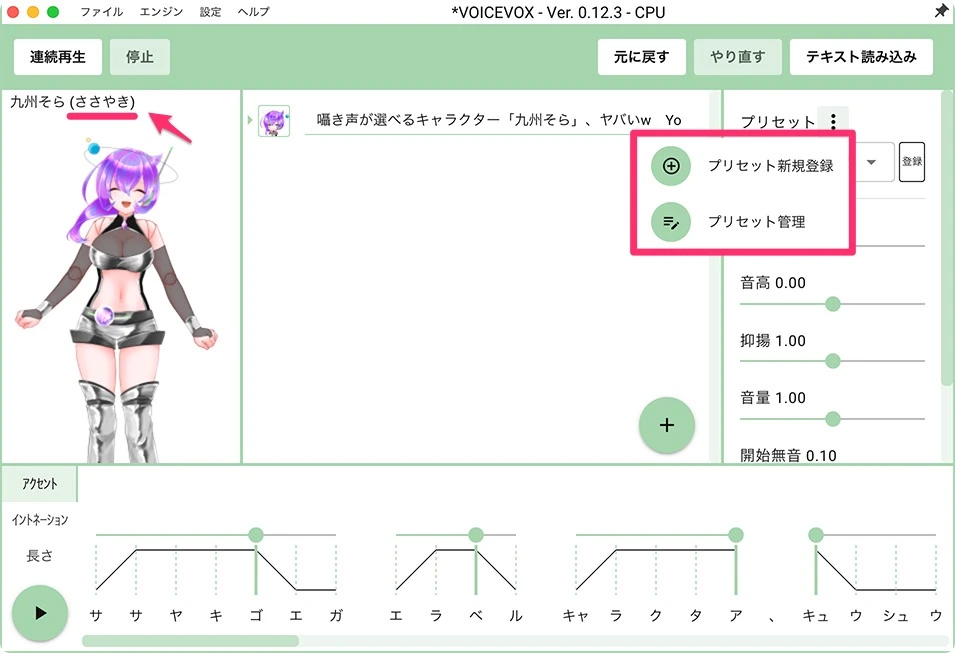 「アクセント」は●を前後に、「イントネーション」は上下にドラッグする。「長さ」は、例えば「ガ」はスライダー左側の「G」と右側の「A」のように、●を左右に分割して細かく調整が可能。 - 「話速(スピード)」「声高(ピッチ)」「抑揚(イントネーション)」「音量」や、開始と終了の無音は、ウインドウ右側のパラメーターでカスタマイズする。設定は、「プリセット」として登録したり、登録済みのプリセットを呼び出せる。