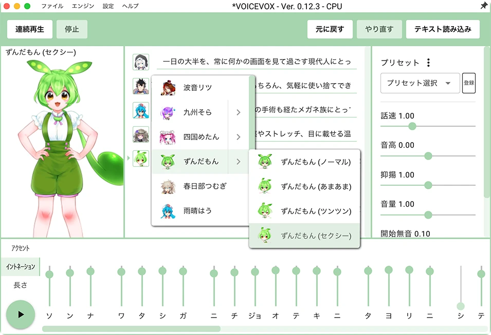 - キャラクターごとに「話速(スピード)」「声高(ピッチ)」「抑揚(イントネーション)」「音量」などを調整可能。カスタマイズした設定は「プリセット」として保存して呼び出せる。