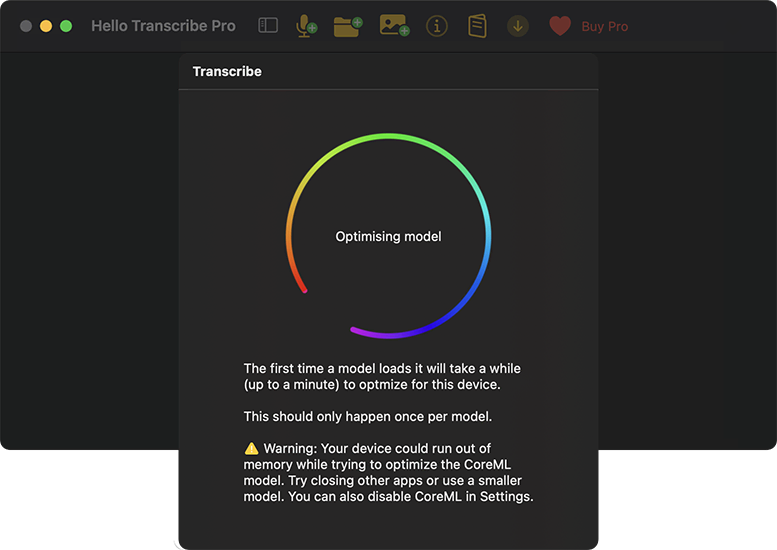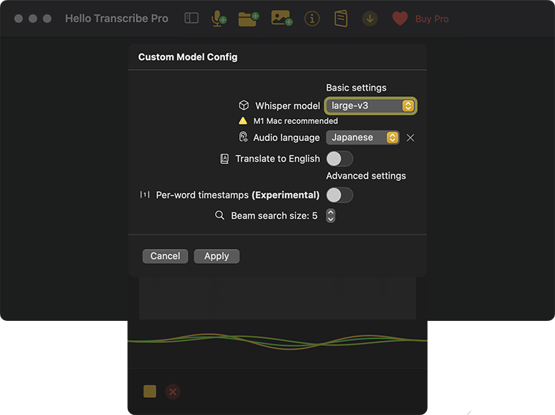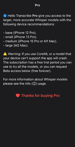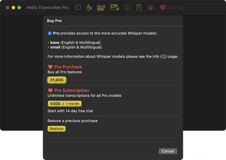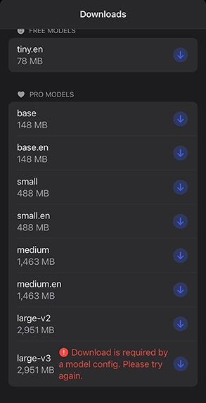 - Hello Transcribe Pro版ライセンスを購入し、追加モデルをダウンロードする(有線またはWi-Fi推奨)。