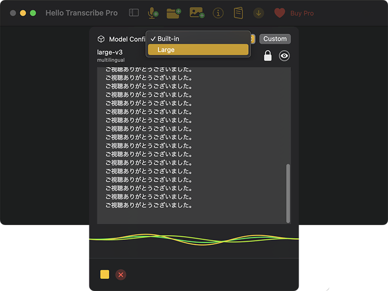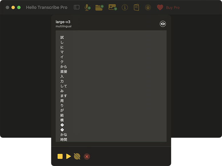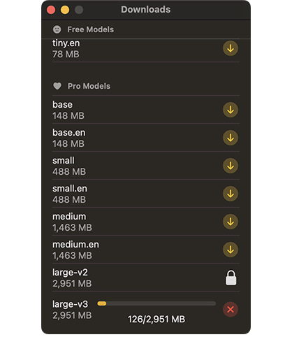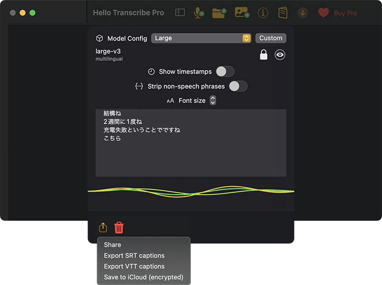 - 日本語も非常に高い精度。予めビルトインされている言語モデル以外に、プロにアップグレードしてbase/small/medium/largeなど、いろいろなモデルデータをダウンロードして使える。