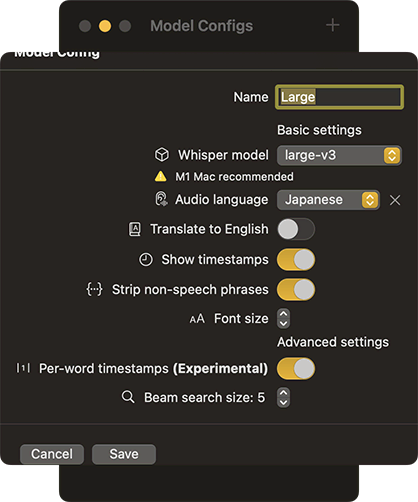 - 処理の負荷がかなり高いので、他のアプリケーションを使いながらは非推奨。MacならApple silicon前提で、Largeモデルを使うならM2以上(M1 MacはMediumモデルまで)。
