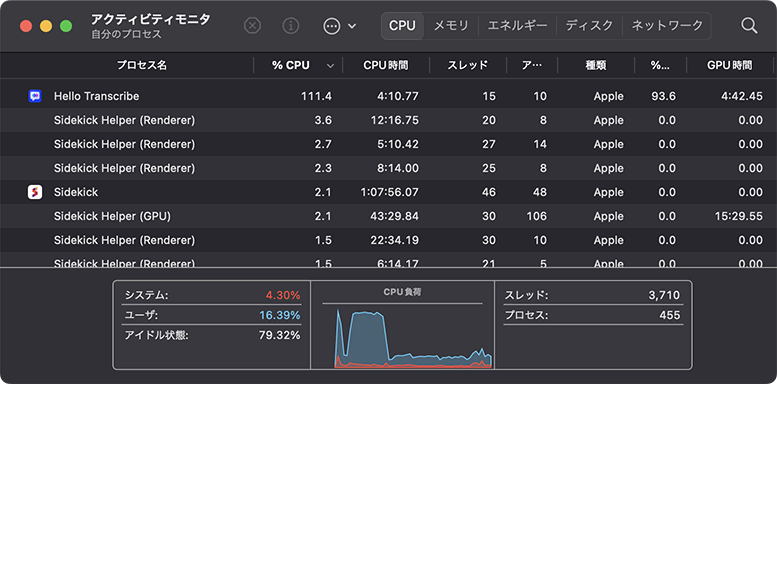 - 途中、他の作業をしない・スリープさせないことを推奨します。普段は意識しないMacのファンが、回転音を鳴らして回り出しました。アクティビティモニタで確認したところ、一時的にCPUの処理が100%を超えていました。