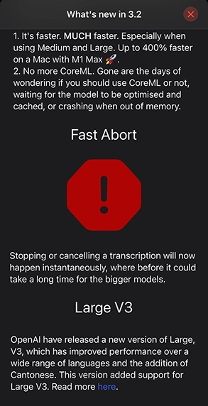 Hello TranscribeというMac/iPhone用の音声書き起こしユーティリティーがバージョンアップして、精度が高いWhisper Large-V3言語モデルが使えるようになったので、レポートします。先日のOpenAI DevDayで発表され、さらに精度が上がったモデルなので、とても高品質な結果が得られました。