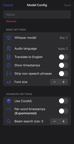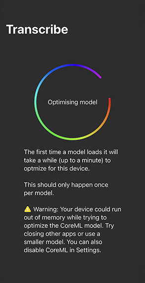 iPhoneで使うのは、あまりオススメではないかも。かなり警告されます。他のアプリを全部終了するように警告されますし、実際、処理中の本体もかなり熱くなります。Largeモデルを使うのは非推奨(iPhone 15 ProでもMediumモデルまで)。