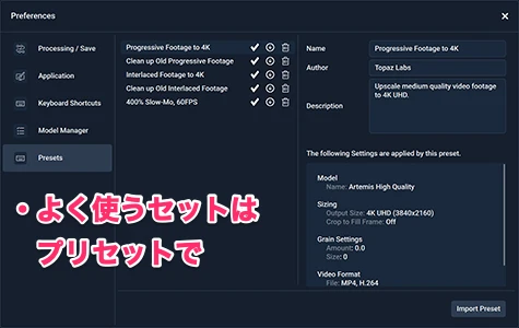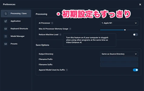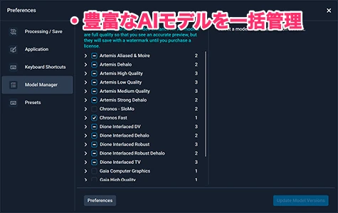 - ビデオを高画質処理する、AIエンジン搭載のアプリケーション。アップスケール(拡大)しなくても、ノイズやインターレース(走査線)の除去、古いビデオの変換など、プロ向けの機能が充実。