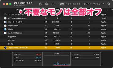 終了させたアプリケーションやユーティリティー:Webブラウザー/メール/ウイルスチェッカー/OS関連/Adobe関連/Dropbox関連/ATOK関連/FigmaなどのDaemon/その他、アクティビティモニタに表示される不要そうなもの - さらにしばらく処理を続け、途中でWi-FiとBluetoothをオフにしたところ、変換速度が0.16〜0.17 sec/frameに微妙に上がった。しかしこれは、その時のフレームで表示されている絵や動きなどの影響だと推測。
