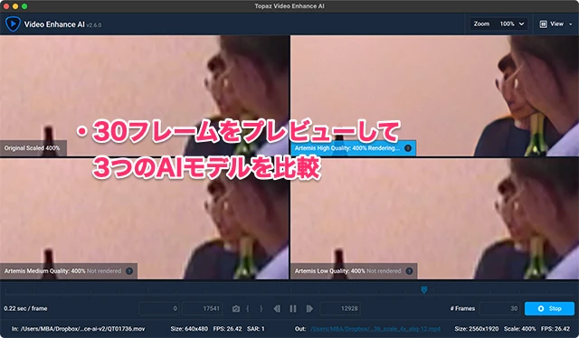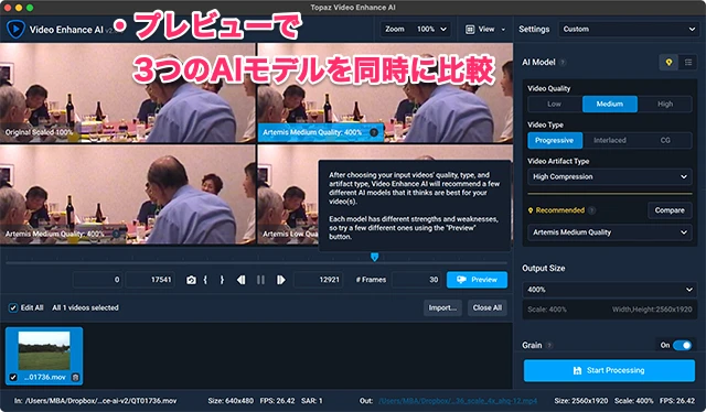 ビデオは、その内容によって処理に使うAIモデルを変えた方がパフォーマンスが向上します。Video Enhance AIは、ビデオに最適なAIモデルを自動判定しますが、手動で比較ながらの選択も可能です。使い方も簡単。