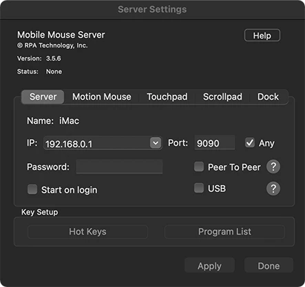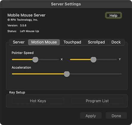 - メニューバーにMotion Mouseのアイコンが表示される。基本的には、Server Settingsで特にカスタマイズする必要はない。好みに応じて、Motion Mouseタブで、マウスポインターのスピードや加速を設定してもいい。