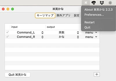 まず、英数/日本語かなの切り替えは、このユーティリティー「⌘英かな」が使えます。私はデフォルトのまま、スペースバーの左のcommandキーを半角英数、右のcommandキーを日本語かなに割り当てています。