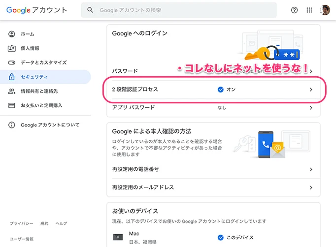- 「セキュリティー」項目を開いて、「パスワード」>「2段階認証プロセス」の詳細を確認する。