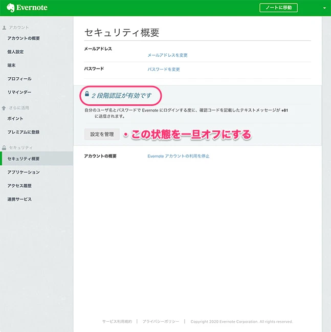 - アカウントのセキュリティー設定を開き、2要素認証を一旦オフにする。