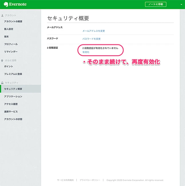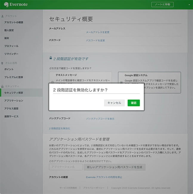 - 2要素認証の設定を登録したい任意のサービスをMacで開き、ログインする(この例ではEvernote)。2要素認証を求められるので、iPhoneのGoogle Authenticatorに表示されるコードを入力する。