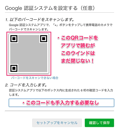 前のステップ4の、2要素認証を一旦オフにする作業が不要なのでスムーズです。とにかく、表示されるQRコードを読み取り忘れないようにだけ注意しましょう!