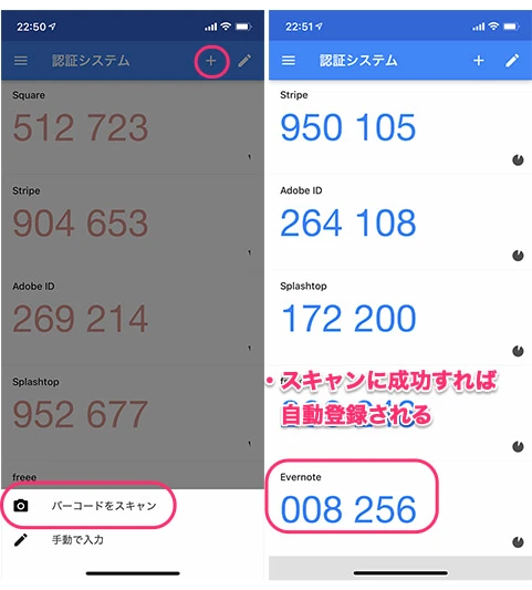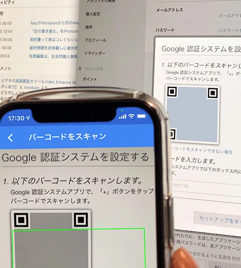 - 新しいiPhoneでGoogle Authenticatorアプリを開き、右上の[+]ボタンをタップする。下に表示される「バーコードをスキャン」をタップし、デスクトップに表示されたQRコードを読み取る。