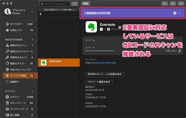 - このQRコードを、Macの1Passwordでもスキャンする。1Passwordでは、任意のサービスが2要素認証(名称はなぜか「2ファクタ認証」)に対応していれば、「ワンタイム・パスワード」が使えることを自動で知らせてくれるので、[QRコードをスキャン]ボタンをクリックする。