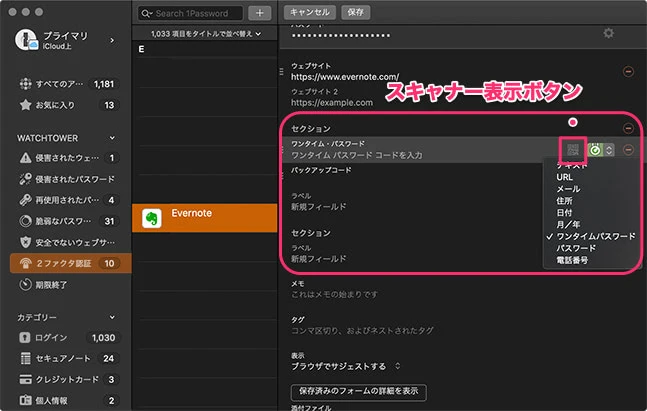 一部のサービスでは、2要素認証に対応していても登録を促されない。その場合は、保管庫に保存したログイン情報を選び、[編集]ボタンをクリックする。新しいセクションでプルダウンメニューに「ワンタイムパスワード」を選び、[スキャナー表示]ボタンをクリックする。