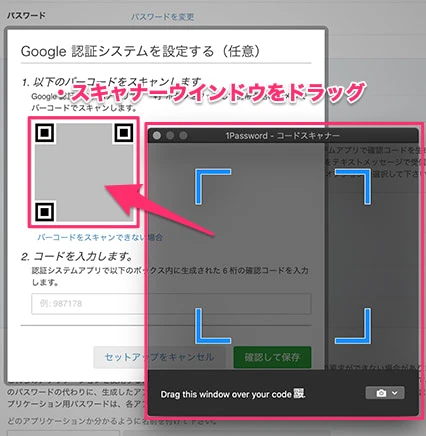 - スキャナーウインドウがポップアップ表示されるので、ドラッグしてガイドをQRコード部分に重ねる。認識されると、スキャナーウインドウは自動で閉じ、同時にクリップボードにコードがコピーされる。サービスのページには、コードを確認する入力フィールドが表示されているので、そこにペーストして、認証を完了する。
