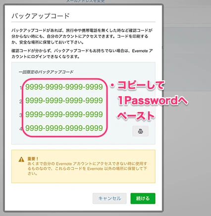 - 多くのサービスで、バックアップコードが表示されるか、手動で生成できるので、コピーして、1Passwordにテキストフィールドを作り、自分で見やすい状態にしてペーストし保存する。サービスによっては、バックアップコードが正しく機能するかまで確認するところもある。