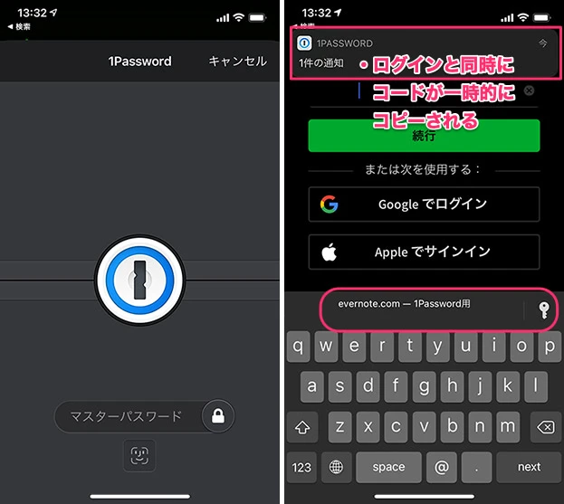 - 同様に、iPhoneからもログインを確認する。1Passwordのログイン情報を呼び出す時に、2要素認証コードが自動的にコピーされるので、フィールドに入力して正しく動作することをチェックすれば完了!