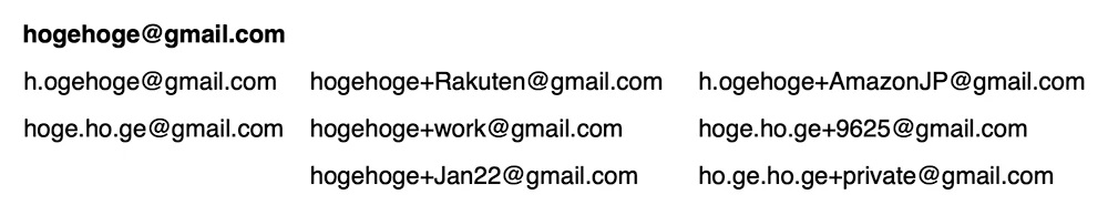 また、プラス(+)の後に続けて文字列を入れて拡張すれば、それらはすべて無視されます。以下の3つも、上記の最初のGmailアドレスで受信できます。