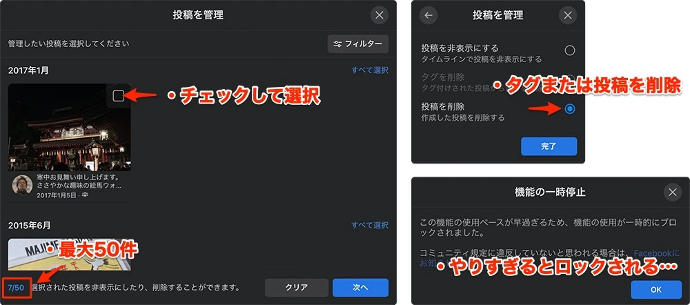 投稿の複数削除は、ウォールの「投稿」に表示される[投稿を管理]ボタンをクリックし、削除したい日付の投稿を選びます。一度にわずか50ずつしか削除できないのと、キャッシュのタイミングなんでしょうか、すぐには削除が反映されず時にはエラーになったりと、決して投稿が多くはなかった私ですら思った以上に相当な手間でした。タグ付けされた写真が1つでも含まれていると、削除できなかったりするのが面倒でした。