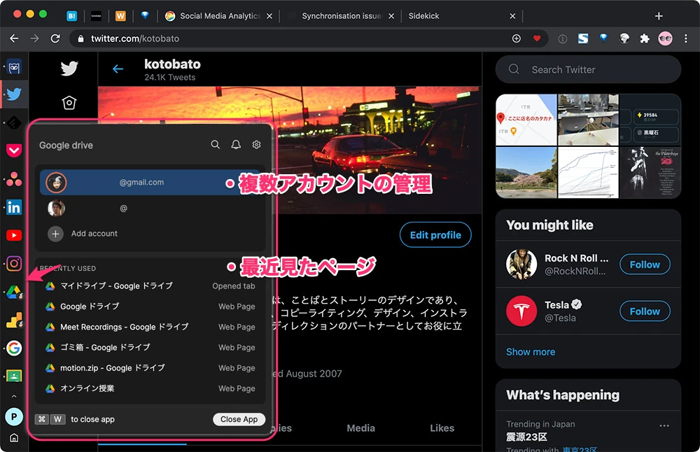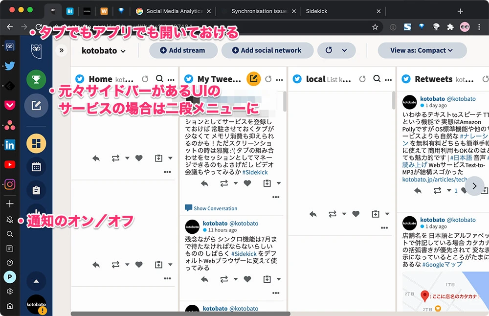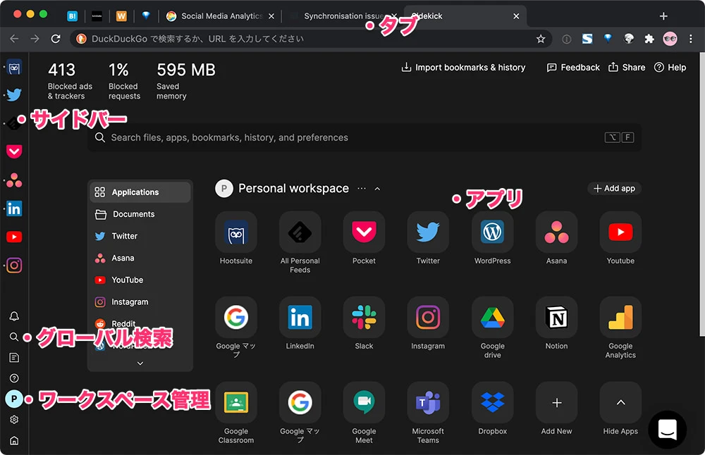 まず、Sidekickの大きな特徴が、ウインドウ左端のサイドバーに縦に並んで表示される「アプリ(一般用語と被るので以下括弧書き)」です。Webサイトのページは、一般的なタブブラウザー同様、ウインドウ上部に横に並べて開いておけますが、タブの代わりに「アプリ」として登録しておくことが可能です。