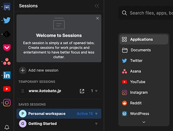 複数のタブをセットとして管理できるセッション機能は、私のお気に入り!macOSにたとえると、複数のデスクトップを自由に切り替えて、アプリケーションやウインドウの表示ごと使い分けるような感じです。