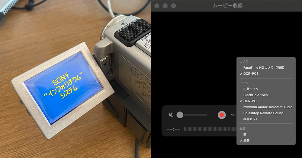 連結したアダプターを中折れさせないように注意して取り回しつつ、MacのThunderboltポートに接続。そしてもう一方のDV端子をHandycamに接続して、電源をON。MacのQuickTime Playerを起動して入力メニューを確認したところ…
