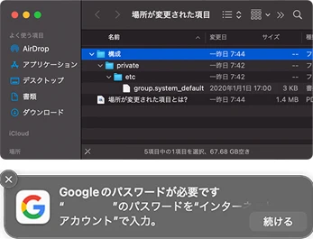 - デスクトップにできた「場所が変更された項目」のエイリアスと、その実態を確認して、削除。私の場合、アルファベット名「Previously Relocated Items」としてもフォルダができていたので、中味ごとこちらも削除。