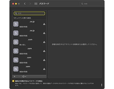 - 「システム環境設定」の新機能「パスワード」と、「通知と集中モード」を確認。「パスワード」については、「セキュリティに関する勧告」をチェック。一応、1Passwordの内容と見比べ、緊急性は高くないと判断したのでしばし保留(後日、編集予定)。