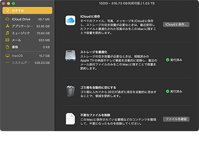 - 「システム情報」-「ストレージ」-「ストレージを最適化」と「不要なファイルを削除」(特に、XcodeのキャッシュとGarageBandの音楽ファイルはデカい!)。