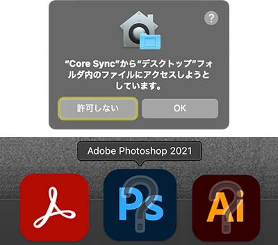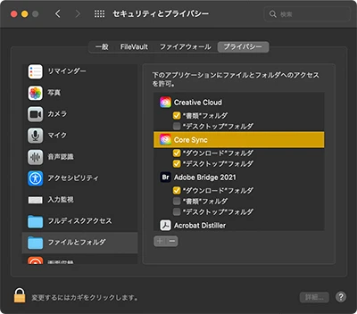 - Adobe CCが同期に使うシステム書類「Core Sync」が特定のフォルダにアクセスするのを再許可。