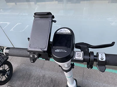 ハンドル部分のQRコードを読み取ってロックを解除したら、中央のアダプターにiPhoneをしっかりセット。前後の仰角はほとんど変えられず、カバーも無いので、太陽の角度によっては画面が見づらそう。あと、今回は途中で街中の風景写真を撮るのに、いちいちアダプターから外さなければならなかったのが、面倒だった(スクリーンショットはそのままで撮影できました)!