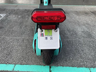 幸い、5分ほど移動した交差点に1台だけあったので、慌ただしく移動しました。今度はちゃんと車体を確認。ナンバーを確認し、こちらも車体をチェック。ナンバープレートがかなり低い位置に取り付けられていて、縁石に触れたりするんでしょう、プレートの端が曲がっていました。そういえば、ポートに停まっているどの車体もこんな感じ。さっきのがたまたまキレイだった。
