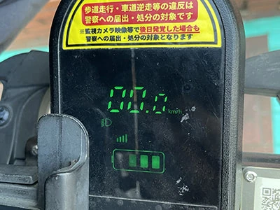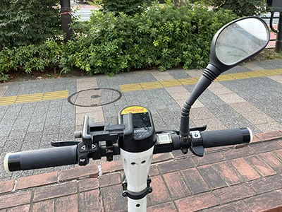 こっちの車体は、導入時期が古いモデルなのか、さっき以上に使い込まれている印象でした。ミラーは、申し訳程度に右側に1本だけあるものの、鏡ではなく薄い金属板のようで、凹凸や汚れも酷く、よく見えません(そういえば、さっきの車体にはなぜかミラーが無かった)。走行中もちら見しながら調整しようとしましたが、設置されている高さも低いので、全然役に立ちませんでした。なお、この後で借りた車体では、根元から折れていたり、車体によって当たり外れがありそうです。